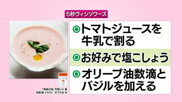 平野さんは、「これが私にとって時短メニューの処女作品」「喉で帳尻が合ってればOK」と語り、もう一品、亡き夫・和田誠さんがトマトジュースに牛乳を混ぜて飲んでいたことから生まれた「5秒ヴィシソワーズ」のレシピも紹介しました。