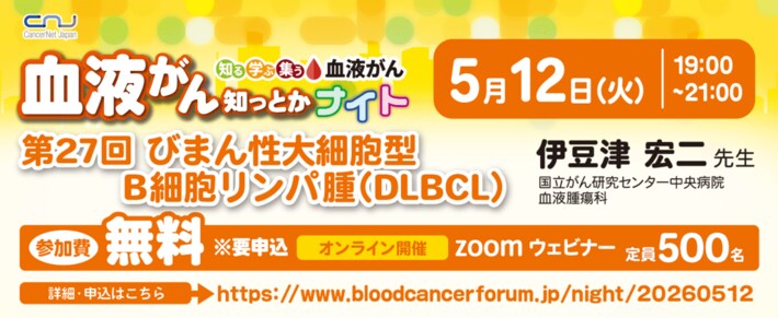 認定 NPO 法人キャンサーネットジャパン(東京都文京区 理事長 岩瀬 哲)は、2023年より毎月1回、血液がんに関するオンラインセミナー「血液がん知っとかナイト」を実施しています。27回目の開催となる2026年5月は「びまん性大細胞型B細胞リンパ腫(DLBCL)」をテーマに開催する運びとなりました。
