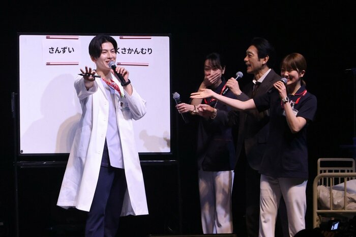 後半は、長谷川さん、樋口さん、飯田さんの「若きエースドクター・都築チーム」、井上さん、曽田さん、梅舟さんの 「クールな外科医・夏井チーム」にわかれて、「チーム対抗!タイムリミット三番勝負」に挑戦。