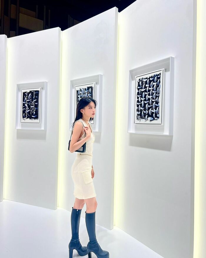 展示を見て回る様子では、ヒールが高い青のロングブーツを履き、カバンを肩に掛け、真剣な表情を浮かべていました。