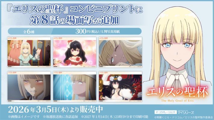 『エリスの聖杯』コンビニプリントでは、話題のキービジュアル、各キャラクターのイラストを使用したブロマイドやシールなど、美しいビジュアルを堪能することが出来るファンも納得のクオリティで提供します。場面写は各話放送終了1週間後の11:00以降に順次追加される予定です。