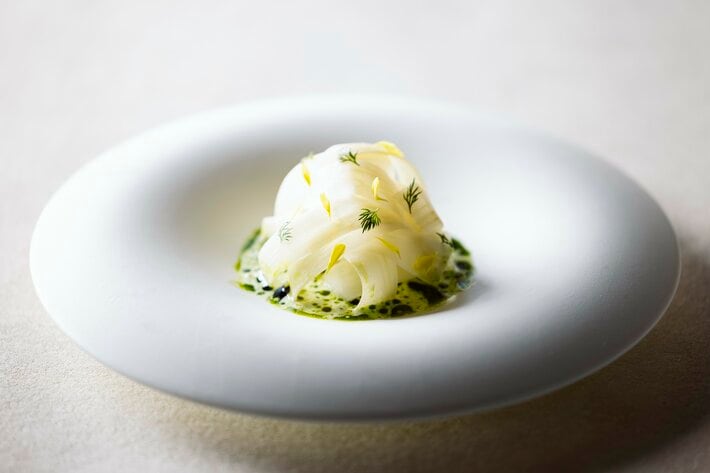 ほのかな苦みが魅力の山菜ウドを、信州の伝統的な食材の鯉に合わせた一皿です。ウドはスライスし、素材そのものの瑞々しさを生かすものと、マリネして酸味を持たせたもの、その2つをドーム状に重ね合わせました。その下には、コリコリとした食感を楽しめる鯉と、軽くスモークして香りを纏わせた鯉が隠れています。鯉のコンソメとハーブが調和するソースが全体にコクと清涼感を与え、洗練された味わいを生み出しています。