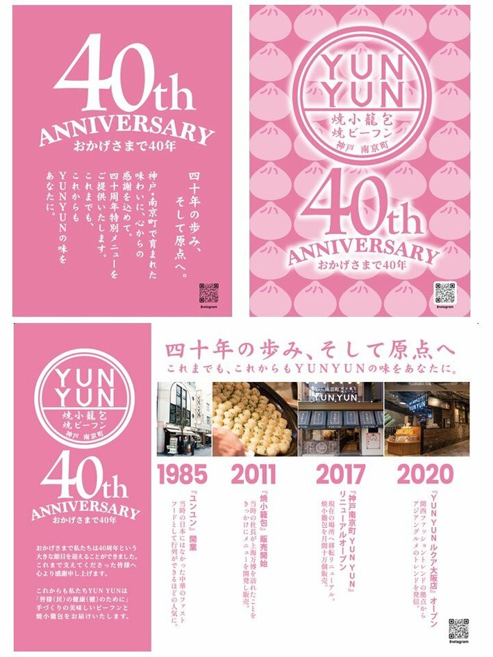 ビーフンシェアNo.1※のケンミン食品株式会社(兵庫県神戸市・代表取締役社長:高村祐輝)が直営する、神戸・南京町のビーフンと焼小籠包の人気店「YUNYUN(ユンユン)」は、2026年に開店40周年となりました。 観光客から地元の皆さままで幅広く愛されたYUNYUNが、これまでのご愛顧に感謝を込めて、3月8日(日)から3ヶ月間、月替わりの「40周年記念・期間限定メニュー」をご用意します。5月には、南京町本店とルクア大阪店でそれぞれ異なる限定メニューが登場予定。 この春はYUNYUNの“できたて・アツアツ”を味わいにぜひお立ち寄りください!