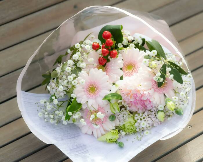花材は、「希望」の花言葉のガーベラ(ピンク)、「平和」の花言葉のオリーブ、カーネーション 、ヒペリカム、カスミ草です。パキスタンの子どもたちに「希望」と「平和」をという思いを込めて、やさしいピンク色でまとめたブーケです。