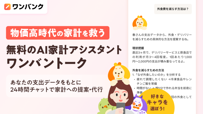 株式会社スマートバンクが運営するAI家計簿アプリ「ワンバンク」は、ユーザー個人の支出データをもとにAIがチャット形式で家計改善の提案・操作実行をするAI家計アシスタント機能「ワンバントーク」を、本日より全ユーザー向けに無料で提供開始しました。