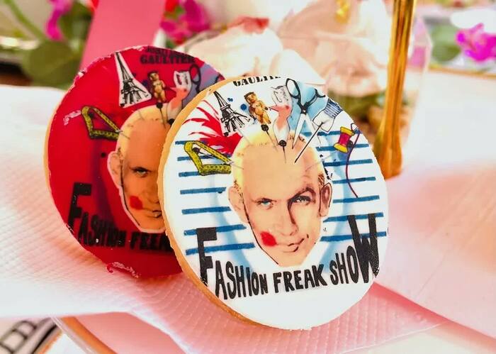 ジャンポール・ゴルチエの顔とショーのロゴがプリントされたマジパンののったクッキーは、見た目よりも甘さ控えめ。