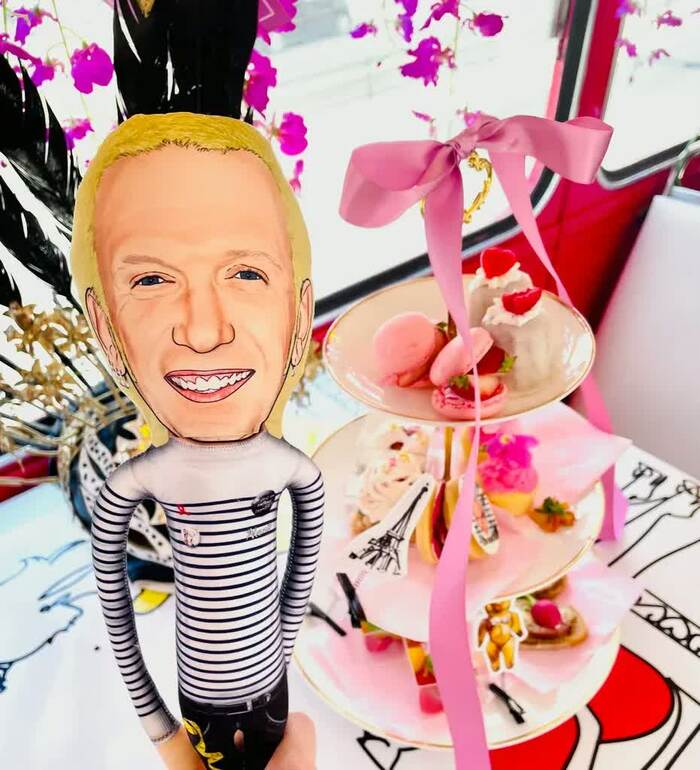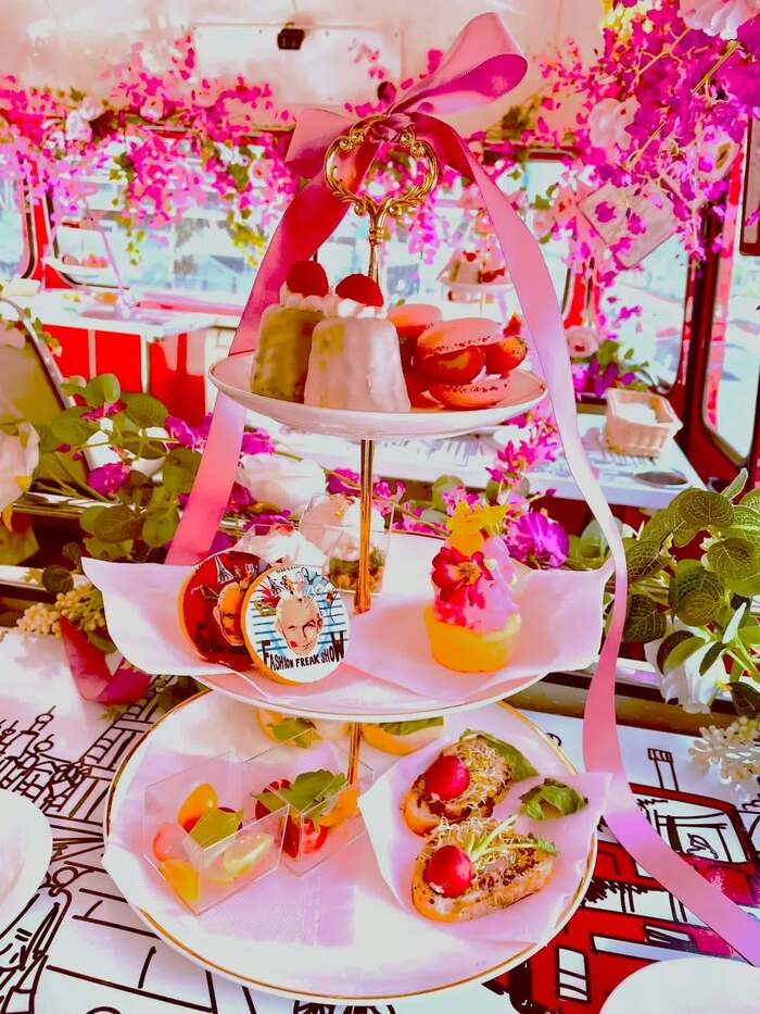そして、バスの出発時刻に。乗り込んだのはパフォーマー2名とインフルエンサーの皆さん。指定された座席に着席すると、テーブルの上にはアフタヌーンティーメニューがセッティングされ、下段にミニハンバーガーなどの軽食、中段にはジャンポール・ゴルチエの顔がプリントされたクッキーや焼き菓子、上段にはピンクのマカロンやカヌレといったスイーツが。