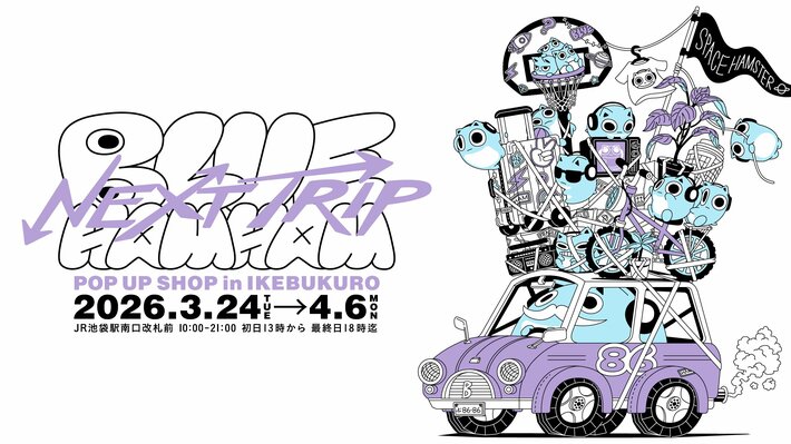 CHOCOLATE Inc.(本社:東京都渋谷区、代表取締役:渡辺裕介)は、デザイナー兼アニメーション作家・有村泰志によるキャラクター「ブルーハムハム」の期間限定イベント、「ブルーハムハム ポップアップショップ NextTrip」を3月24日よりJR池袋駅(東京都豊島区)南口改札前にて開催することをお知らせいたします。今回は「NextTrip」をテーマに、新生活が始まる春の季節に合わせ、ブルーハムハムたちが次の旅へと向かう様子を描いた新作アートを公開。イベント会場では、同アートをあしらったアパレルや雑貨、定番のぬいぐるみなどのアイテムを多数販売するほか、購入者限定のノベルティも登場いたします。