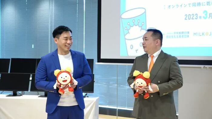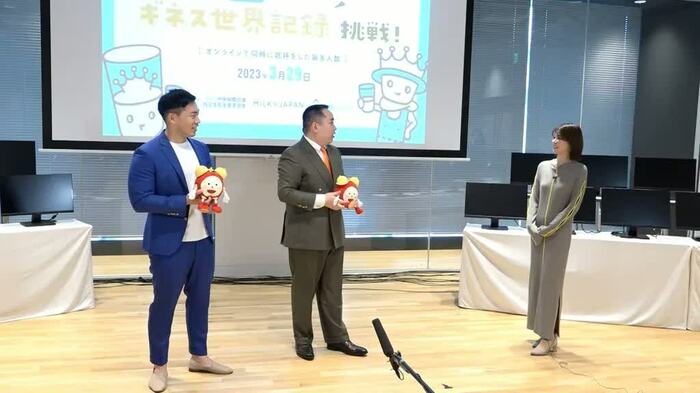 ミルクボーイ(駒場孝さん、内海さん)が、酪農業界の危機と牛乳の魅力を知ってもらうことを目的とした「スゴいぞ!牛乳」ギネス世界記録挑戦イベントに出席。