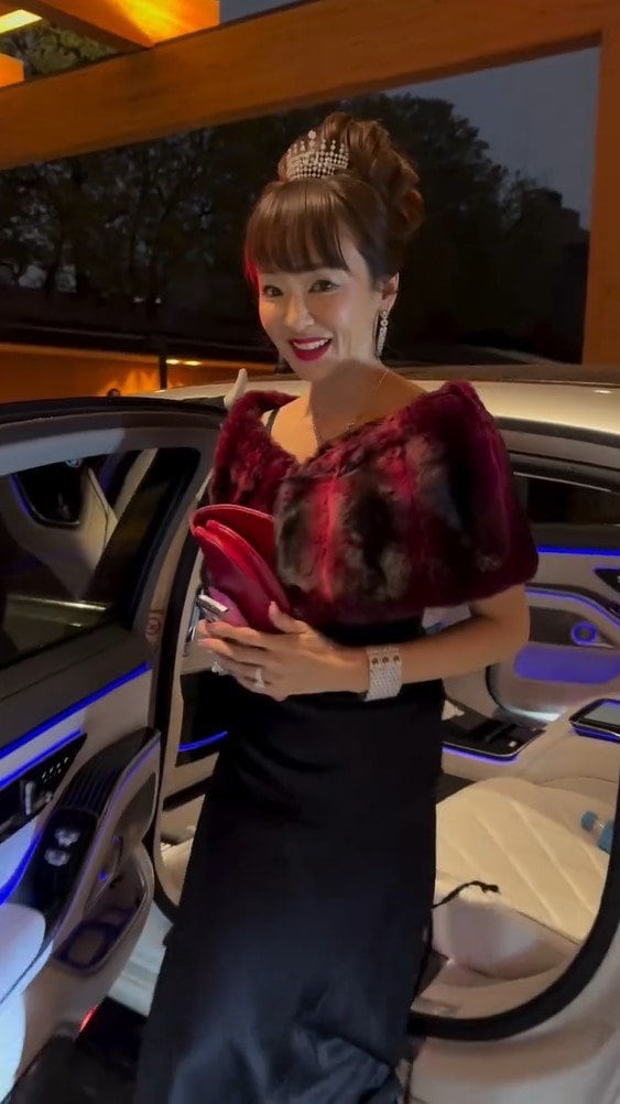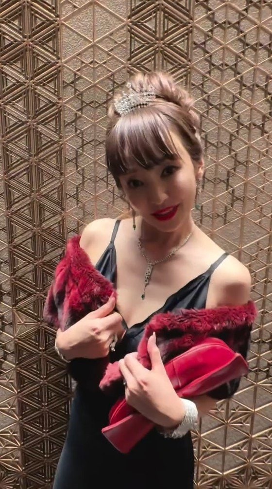 ドアが開くと、ドレスアップした神田さんが笑顔で降りてきました。神田さんは黒のタイトなキャミソールドレスに赤いファーのボレロをまとい、アップヘアのトップにはティアラをのせていて、上品なスタイルがとってもよくお似合いです。