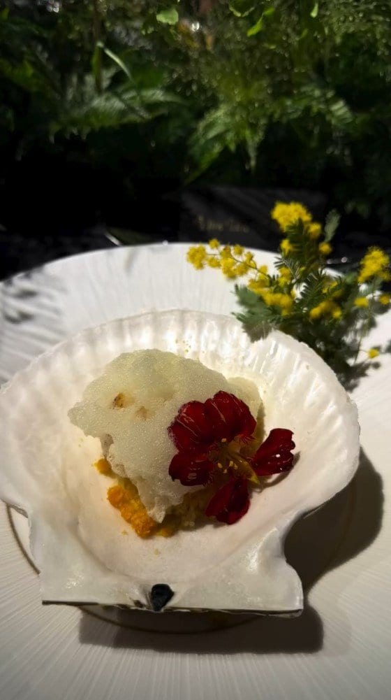貝殻をモチーフにした器には、ココナッツのパンナコッタのようなデザートがのっていて、そばには赤いエディブルフラワーが添えられています。