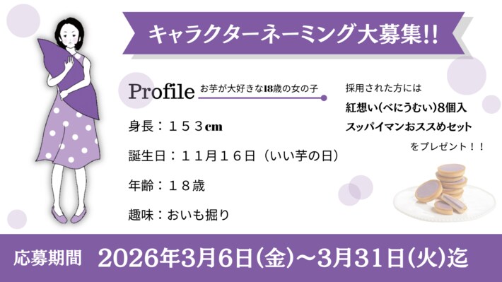 「紅想い」のパッケージに描かれている少女キャラクターの公式ネーミングを一般募集します。本キャラクターは「お芋が大好きな女の子」をコンセプトとしたオリジナルキャラクターです。以下のプロフィール設定をもとに、親しみやすく覚えやすい名称を募集します。