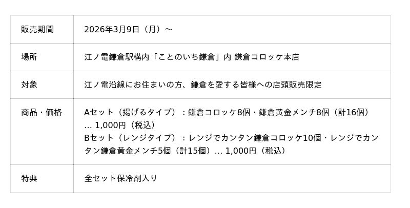 株式会社駿河屋本舗(本社:神奈川県鎌倉市 代表取締役:丸山均)は、看板商品『鎌倉コロッケ』の誕生30周年を記念し、江ノ電エリアサービス株式会社の協力のもと、2026年3月9日(月)より江ノ電鎌倉駅構内の「江ノ電鎌倉駅本店」にて、沿線住民の方々を対象とした「30周年記念 地元還元特別販売」を実施いたします。日頃の感謝を込め、通常価格1,500円以上の人気冷凍セット2種を、各税込1,000円の特別価格で販売。2月にリニューアルしたばかりの店舗にて地域の皆様をお迎えいたします。