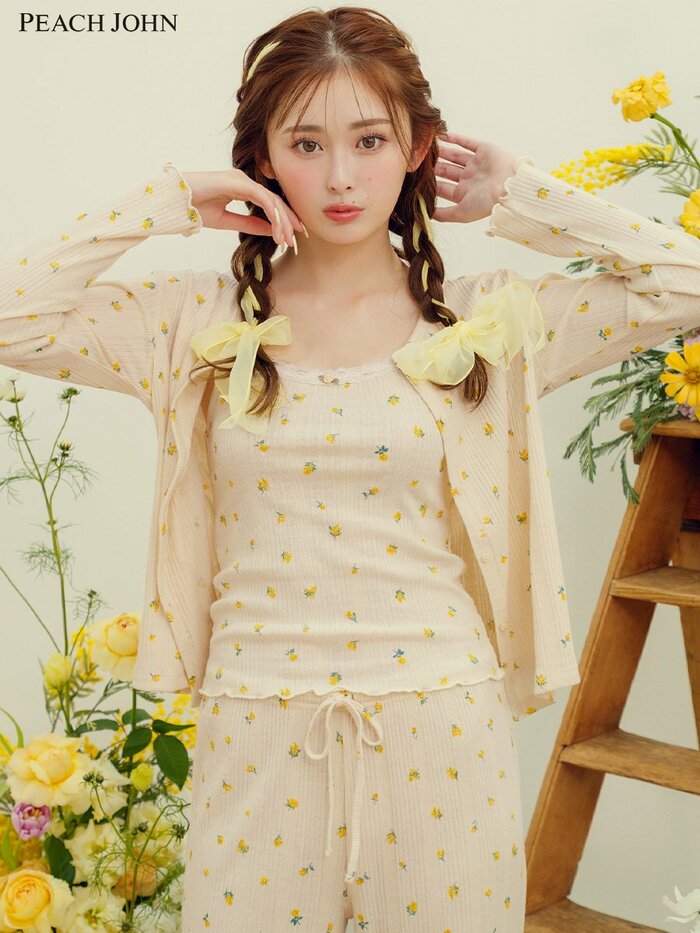 おうち時間を快適に過ごせる「コットン混リブパジャマ3点セット」にも大注目です。カーディガン、キャミソール、ロングパンツがセットになっており、小花柄がやさしい印象を与えます。単品使いもできるため、幅広いコーディネートが楽しめます。
