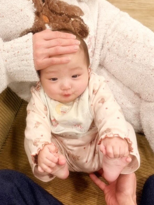 そして、両足の指をつかみながらごろんと横になったショットも!杉浦さんは「ずっと足つかみポーズがお好きです 成長だねぇ」と、このポーズが夢空ちゃんのお気に入りであることを明かし、足の存在に気が付いた夢空ちゃんの成長をしみじみと感じているようです。