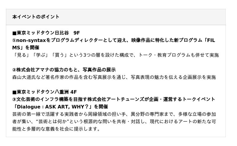 「アートフェア東京」との連携を通じて、街づくりにおける文化価値向上を目指し、文化・芸術の発信拠点である東京ミッドタウン日比谷では鑑賞にとどまらないアート体験の創出を推進、日本と世界をつなぐ玄関口・東京ミッドタウン八重洲ではビジネスとアートの融合による交流機会を創出します。本連携により、東京の文化的プレゼンスを高め、都市の魅力とエリア価値のさらなる向上を目指します。