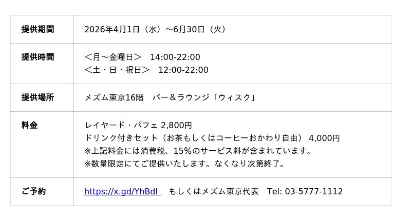 東京の躍動感や波長と共鳴し、上質な空間でクリエイティブな体験ができるモダンラグジュアリーホテル『メズム東京、オートグラフ コレクション』(港区海岸1-10-30/総支配人 生沼 久)は、16階バー&ラウンジ「ウィスク」にて、2026年4月1日(水)から6月30日(火)までの期間限定で、抹茶の奥深い苦みとショコラのビター感を重ねた抹茶とガナッシュの「レイヤード・パフェ」を提供します。