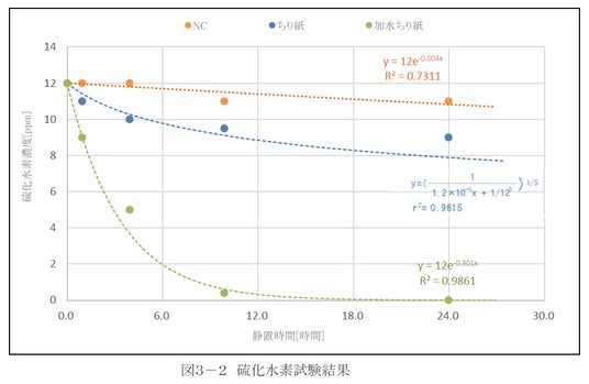 アンモニアのグラフでは、青色と緑色の線が、すぐに下降しているのが分かります。具体的な数字では、水分を含んだ「めりふわ」(加水ちり紙)は54分(0.9時間)経たずに、においの実測値が約87%減少しました。9時間48分(9.8時間)後は92%減っています。