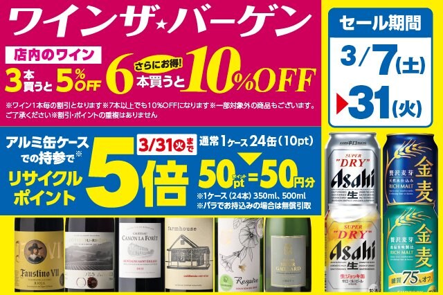 リカーマウンテン各店では3月7日(土)から「ワイン・ザ・バーゲン」を開催します