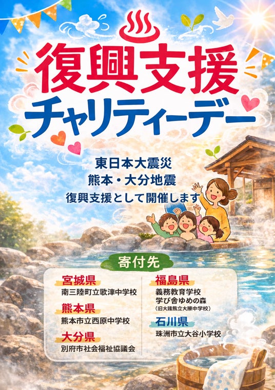 本企画は、東日本大震災、熊本・大分地震、そして能登半島地震の復興支援として実施するもので、期間中の売上は全額を寄付いたします。温泉を楽しんでいただく時間が、被災地への支援につながる取り組みです。