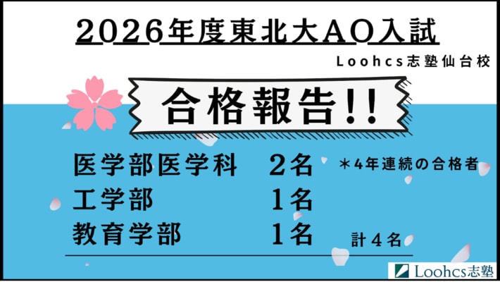 2026年度東北大学AO2期・3期入試で医学部医学科2名を含む4名の合格者を輩出いたしました。医学部医学科への合格は4年連続となります。Loohcs志塾仙台校は、今年度を含め過去4年間で20名(医学部医学科6名)の合格者を輩出いたしました。
