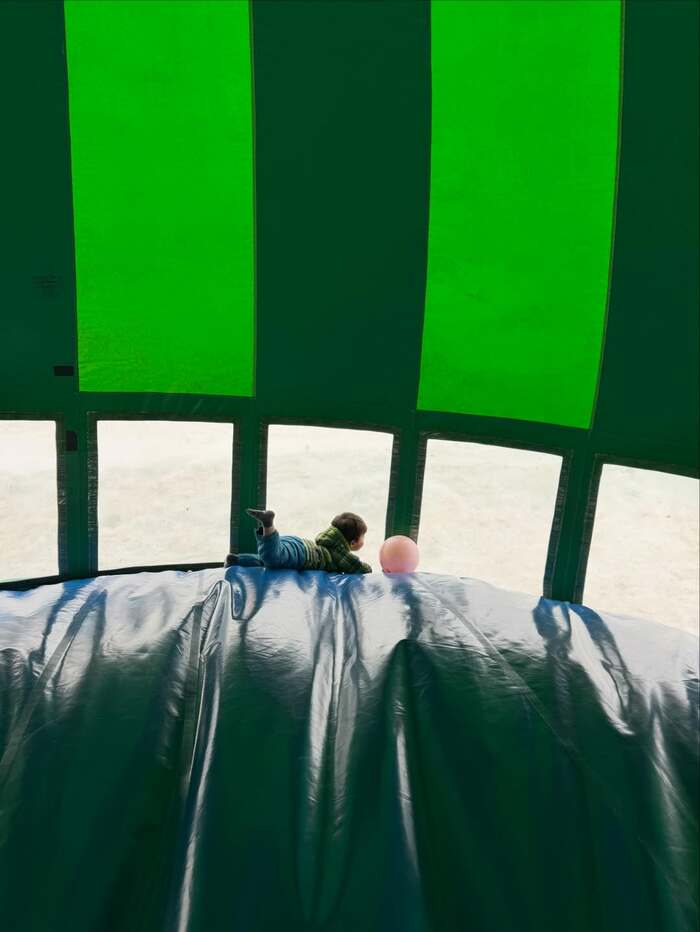緑色の半透明な壁に囲まれた空間で、青い滑り面の縁に横たわっている長男。近くにはピンク色のボールも置かれ、不思議な空間でのびのびと遊ぶ様子がうかがえます。