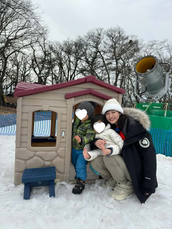 そんな新井さんが今回の投稿で、「夏も冬も気軽に行ける軽井沢♪\(^o^)/」「先日は冬の終わりに、息子を「ソリデビュー」させてきました☆」と報告。