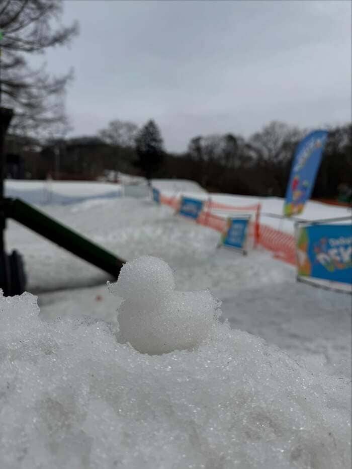 背景にはスノーパークの柵や旗が見え、雪遊びの合間に作られたであろう可愛らしい雪玉が、冬の思い出のひとコマを切り取ったようで、心が和みます。