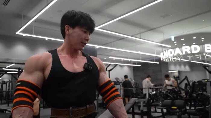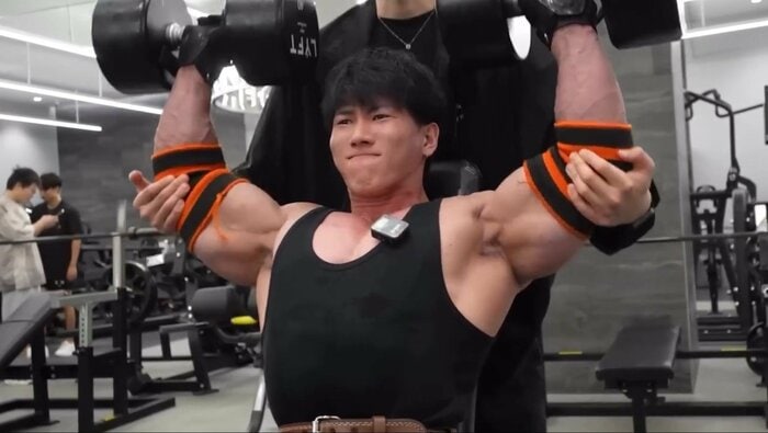 肩幅ほどに足を開き、背筋を伸ばして両手でダンベルを持つトレーニングでは、歯を食いしばっていて、つらそうな表情を浮かべます。その上半身の大きさはTシャツ越しでも分かるほど圧倒的で、顔がひときわ小さく見えるほどの迫力をしています。