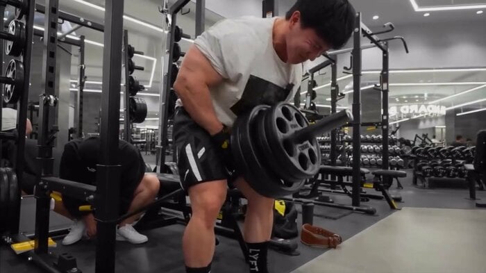 まずは、バーベルの片端をスタッフが床に固定し、もう片端に重りをつけて前傾姿勢でおなかの方へ引き上げるトレーニングです。横川さんはバーを持ち上げるとき、目をぎゅっと閉じて力を込めていて、見ているだけできつさが伝わってきます。