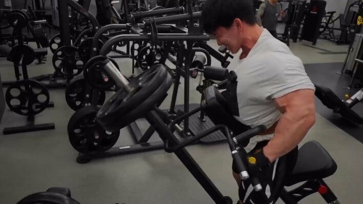そして、斜めになったパッドに胸を当て、両手で左右のハンドルを握って重りを持ち上げます。ハンドルを力強く引き寄せた腕は丸太のように太く、隆起した筋肉が存在感を放っています。
