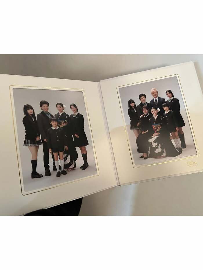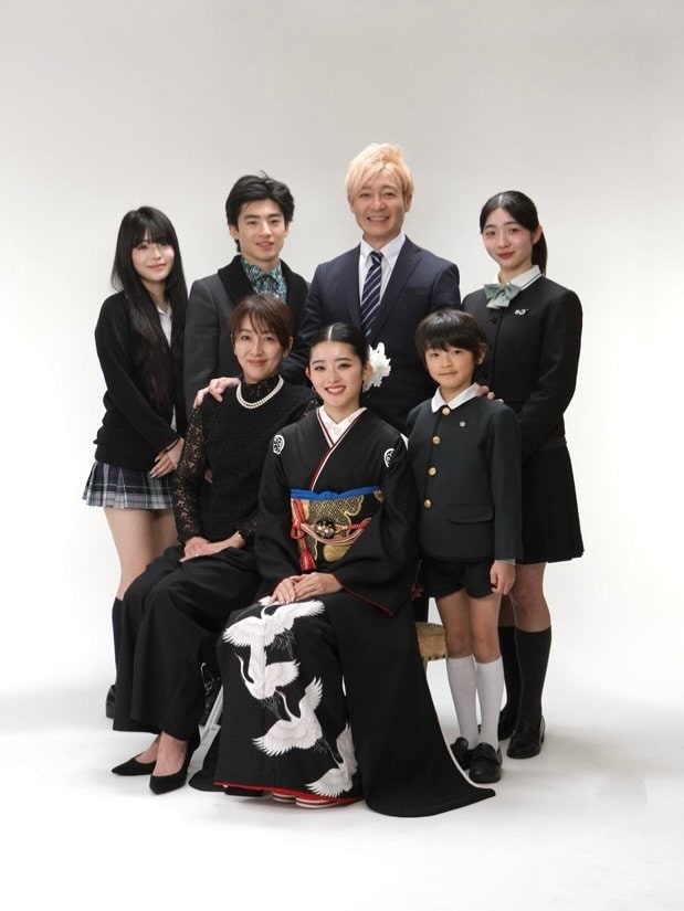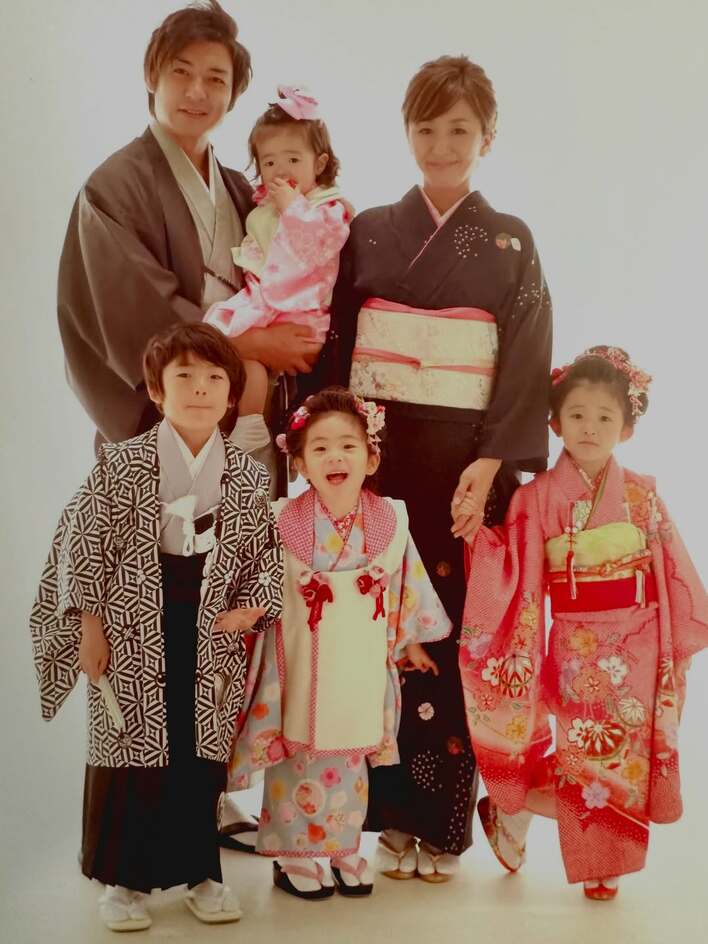 さらに公開されたのは、15年前に撮影されたという家族写真。こちらも白い背景のスタジオで撮影され、家族全員が和装姿で写っています。茶系の着物を着たつるのさんは三女を腕に抱き、その隣には黒地の振袖姿の妻が寄り添っています。