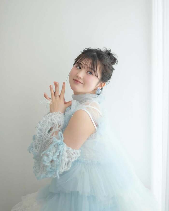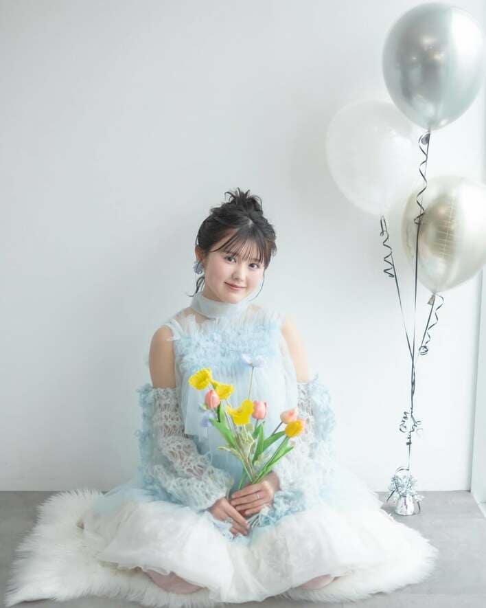 シルバーやゴールドの豪華なバルーンが飾られた空間で、水色を基調としたチュールドレスに身を包み、にっこりとほほ笑むショットを公開しました。池田さんは華やかなアップヘアをし、手元にお花を持っていて、澄んだ瞳と透き通るような肌が印象的です。
