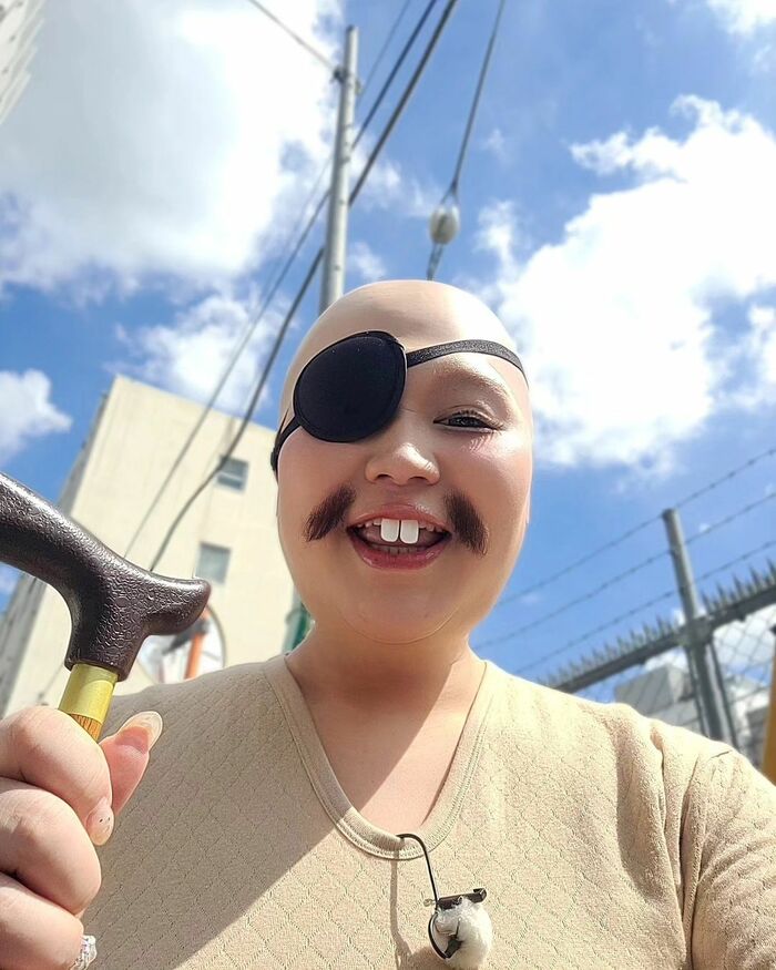 投稿された写真には、丹下段平のトレードマークでもある白いタオルを首に巻き、黒い眼帯を付け、ベージュの長袖トップスに茶色の腹巻きをし、黒色のボトム姿に、つえを持ったりんごちゃんの姿が。