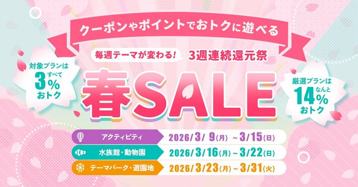 春休みのお出かけ需要が高まる季節、「お得に、充実した体験をしたい」というゲストの皆様の声にお応えし、全国のテーマパーク、水族館、動物園、アウトドア体験など、幅広いジャンルを対象とした大規模セールを実施します。期間中は3つのフェーズに分かれ、対象ジャンルが週替わりで登場します。