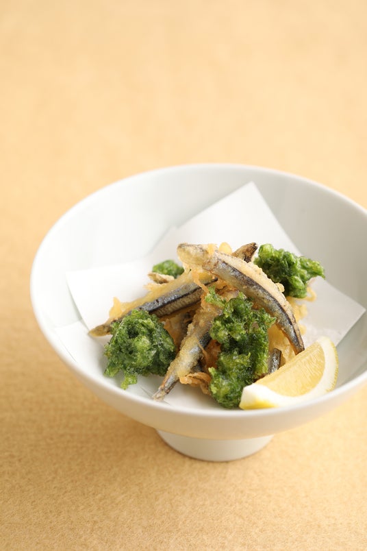五島列島でよく食べられる魚の一つであるきびなごを、一夜干しにして旨みを凝縮させてから天ぷらにしました。あおさ海苔の天ぷらと盛り合わせることで、豊かな香りと鮮やかな色合いもお楽しみいただけます。