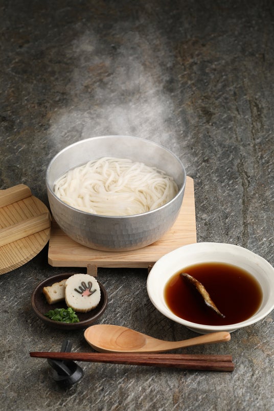 「五島手延べうどん」は、1000年以上の歴史を持つ五島を代表する名産品です。細身でコシが強く、滑らかさと喉ごしの良さを持ち合わせる五島のうどんを、あえんの店舗にご用意しました。釜揚げ風に、五島のきびなごとあごだしのつけ汁でお召し上がりください。