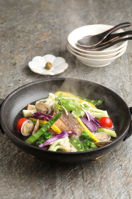 春が旬のメバルを塩麹に漬けてさっと揚げ、サヤエンドウやアスパラガスなどのたっぷりの春野菜と一緒に出汁で炊き上げました。添えられた柚子胡椒の香りと一緒にお楽しみください。