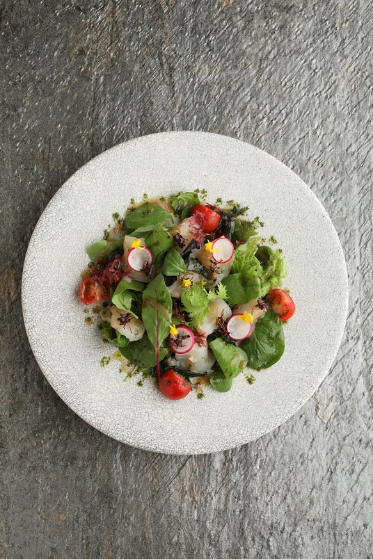 長崎県五島市福江島の金沢鮮魚から直送された、五島近海魚をカル パッチョにし、トマトやベビーリーフなどのたっぷりの野菜と共にサラダに仕立てました。ドレッシングのわさびの風味が、魚介の旨みを引き出します。
