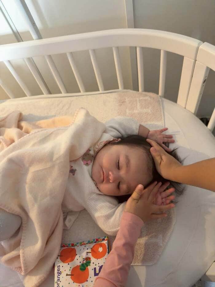 そして今回の投稿では「寝起きのなでなで♡」とつづり、ベビーベッドの中で目を閉じている“ググガガちゃん”のショットを公開。
