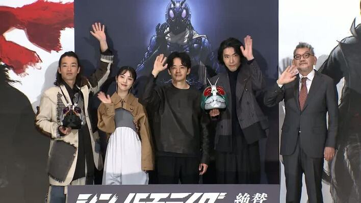 池松壮亮さんが主演を務める、映画「シン・仮面ライダー」の大ヒット御礼舞台挨拶が行われ、池松さん、浜辺美波さん、柄本佑さん、森山未來さん、庵野秀明監督が登壇しました。
