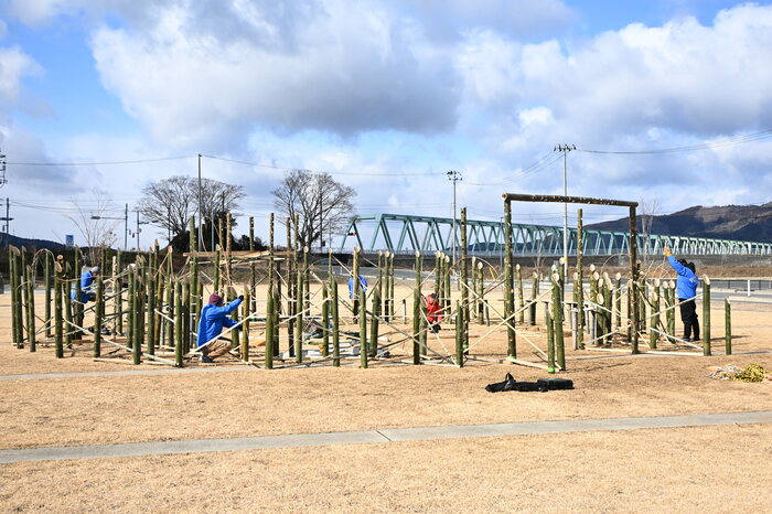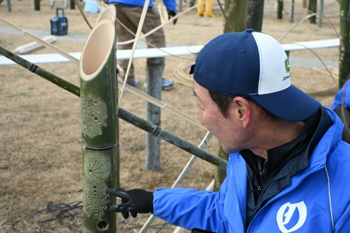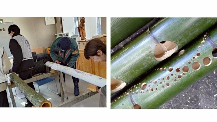 今年は、2026年1月25日に竹の切り出し作業を行い、翌週以降は毎週日曜日に「竹あかり制作ワークショップ」を開催。デザイン画を竹に貼り、ドリルで穴を開けて作られています。