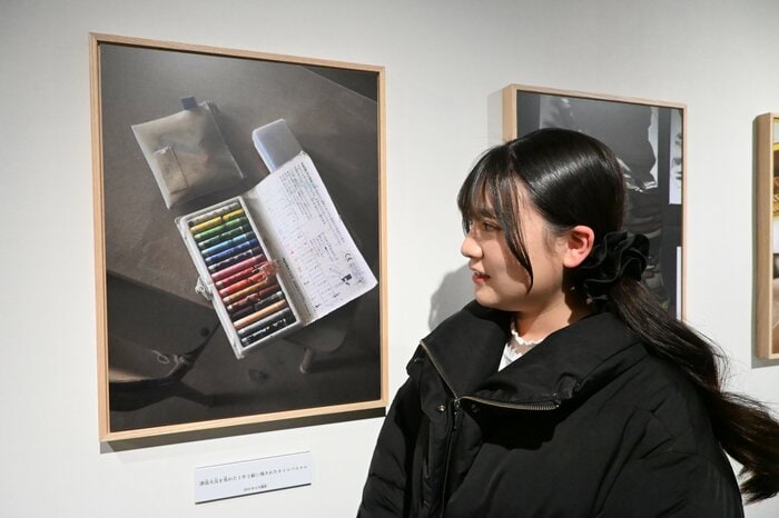 取材時、震災遺構となった母校を見て回る中で、展示されていた「クレヨンの写真」の前で足を止めた、髙橋さん。