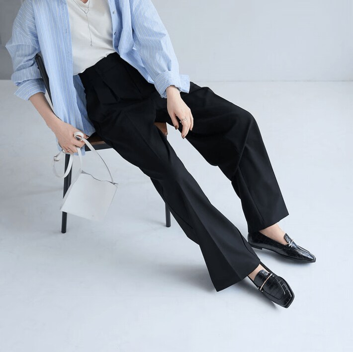 スクエアローファー/ショップ名:minkymeee“フレッピー”スタイルには、黒のシックなスクエアローファーが好相性。青シャツと合わせれば、スマートで爽やかな印象に。