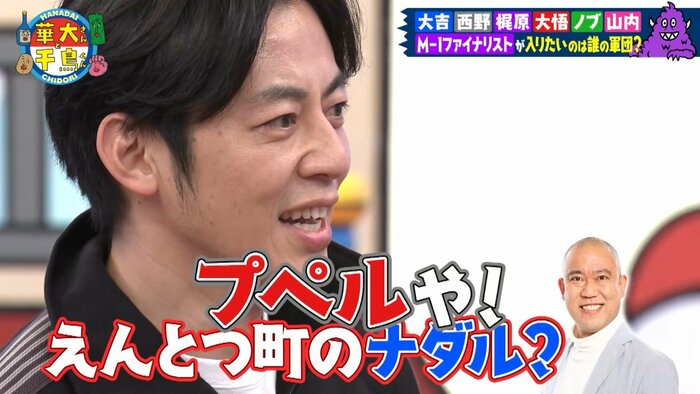 西野:ちょっと待って、思い出した!このメンツ、僕、嫌いなんです。前身番組(『華丸大吉&千鳥のテッパンいただきます!』)に出させていただいたとき、ここの“岡山の坊主”(=大悟さん)がですね、なんか僕のことをですね…なんて言った?