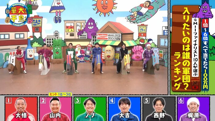 博多華丸さん、博多大吉さん、千鳥(大悟さん、ノブさん)、かまいたち(山内健司さん、濱家隆一さん)さんを含めた6人がランキングに参加し、お題に対して全員で順位を予想しました。