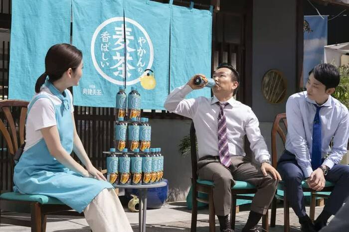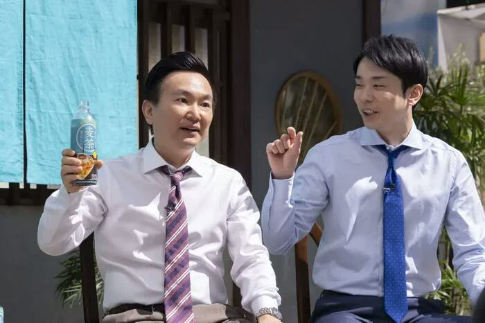 この新TVCM「やかんの麦茶 夢中でゴクゴク」篇は、やかんの麦茶屋の店主である小芝さんと、常連客のかまいたちによる軽快な会話劇。