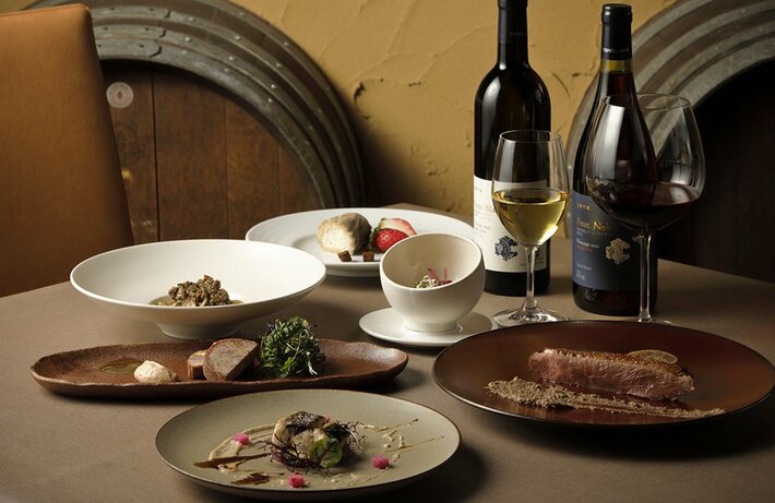 ディナー会場となるのは、京都丹波ワインの農園やワイナリーに併設するぶどう畑が一望できるレストランです。地元食材を使い、地産地消をコンセプトに旬の食材とワインをゆっくりお楽しみいただけます。