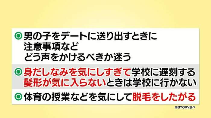 雑誌「STORY」には、思春期の子供が身だしなみを気にしすぎているという、母たちの悩みが寄せられているそうです。