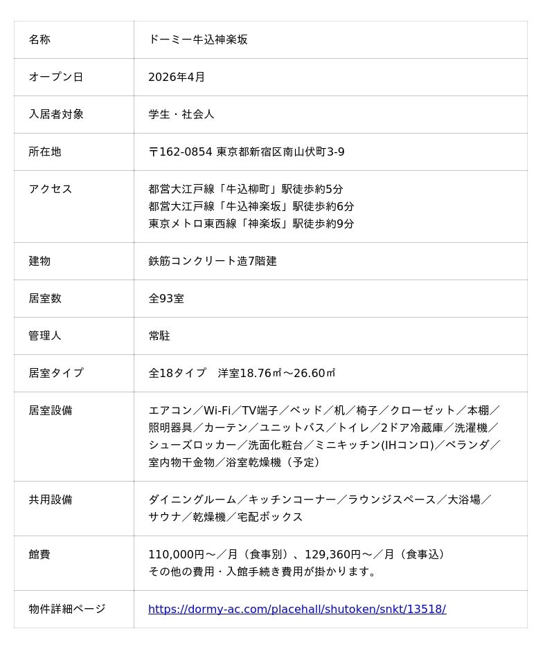 「ドーミー」の名称で全国約500棟以上の学生寮・社員寮を展開する株式会社共立メンテナンス(以下、共立メンテナンス/代表取締役社長:中村 幸治/本社:東京都千代田区)は、東京都新宿区に、リノベーションした学生寮『ドーミー牛込神楽坂(うしごめかぐらざか)』を2026年4月にオープンいたします。